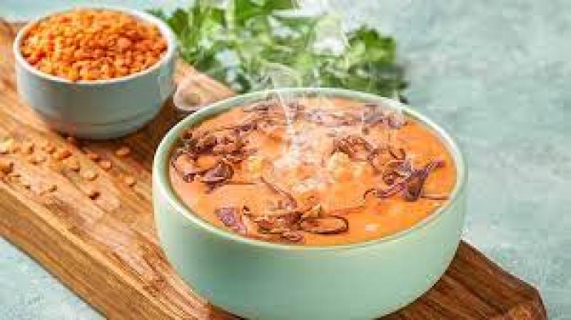 يوضع الجمبريو 1 ملعقة كبيرة من البصل المحمر في شوربة الجمبري.