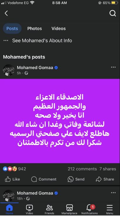 وطمأن محمد جمعة جمهوره ومتابعيه عليه، وكتب عبر حسابه الشخصي بموقع التواصل الاجتماعى "انستجرام"، قائلا: "الأصدقاء الأعزاء،والجمهور العظيم، انا بخير ولا صحه، لشائعة وفاتي وغدا إن شاء الله هاطلع لايف على صفحتي الرسميه شكرا لك من تكرم بالاطمئنان".