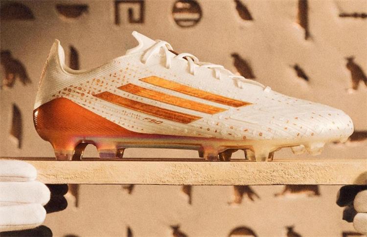 يتميز حذاء محمد صلاح الجديد بقاعدة بيضاء نقية، مبتعداً عن الألوان النيونية الصاخبة، مع خطوط "أديداس" الثلاثة وشعار "F50" باللون الذهبي. يحمل الحذاء نقوشاً هيروغليفية دقيقة بلون رملي محفورة على الجزء العلوي، مستوحاة من كثبان الصحراء المصرية وتاريخ الحضارة القديمة.