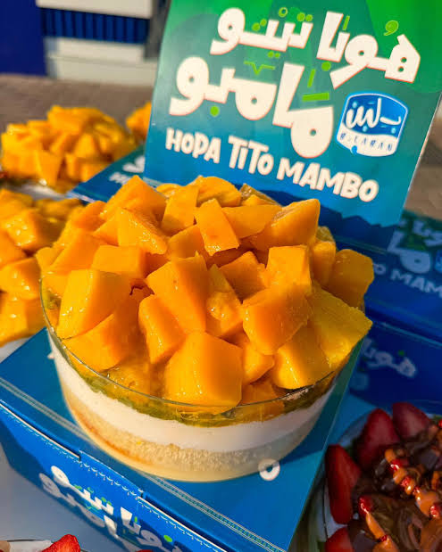 - للزينة النهائية: شرائح طازجة من المانجو الإسماعيلي أو الفراولة، مع صوصات اختيارية مثل النوتيلا أو الكيندر أو الفستق.