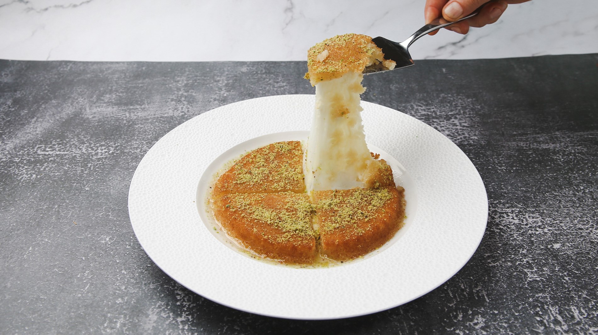 كما يمكن تزيين الكنتفة بالفستق المجروش لإضافة لمسة جمالية ومذاق غني، وتقديمها مباشرة للتمتع بالنكهات المتناغمة بين القاعدة المقرمشة والجبن الذائب والشربات الحلو.