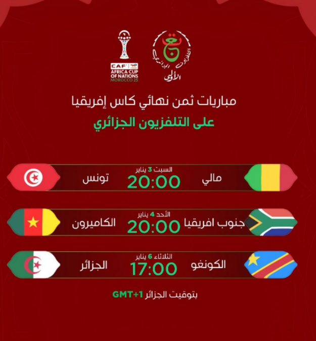 هل مصر في القائمة؟ جدول مواعيد مباريات ثمن نهائي كأس أمم أفريقيا 2025 المذاعة على التلفزيون الجزائري