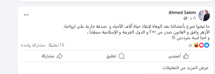 حيث كتب الإعلامي أحمد سالم في منشوره عبر موقع الفيس بوك أنه يمكن للجميع التبرع بالأعضاء بعد الوفاة ويكون ذلك من أجل إنقاذ حياة الاف من الأشخاص الأحياء الذين يعانون من أزمة صحية.