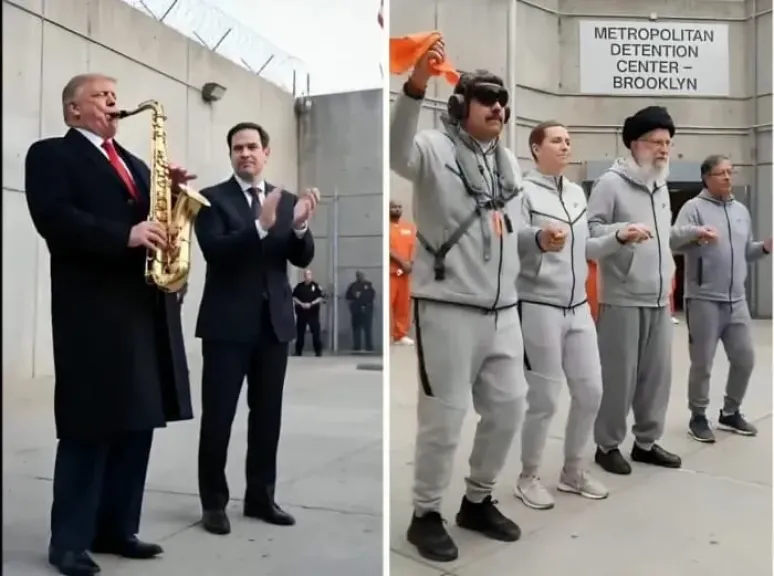 وانتشر خلال الساعات الأخيرة مقطع فيديو مصنوع بتقنيات الذكاء الاصطناعي، يظهر خلاله، مجموعة من الرؤساء يرتدون ملابس السجن، وبجانهم الرئيس الأمريكي دونالد ترانب وهو يعزف لهم.