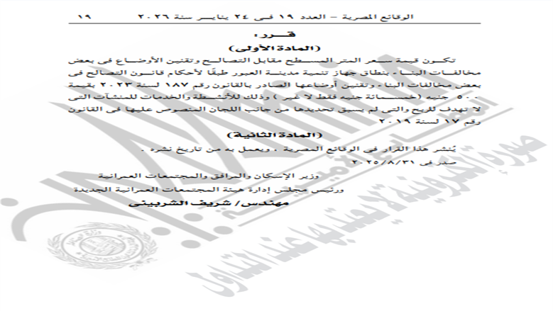 حددت الوزارة سعر المتر بـ500 جنيه في مدينة العبور للأنشطة غير الربحية التي لم يسبق تقييمها من قبل اللجان المختصة، وفق ما نُشر في الجريدة الرسمية العدد 19 بتاريخ 24 يناير 2026.