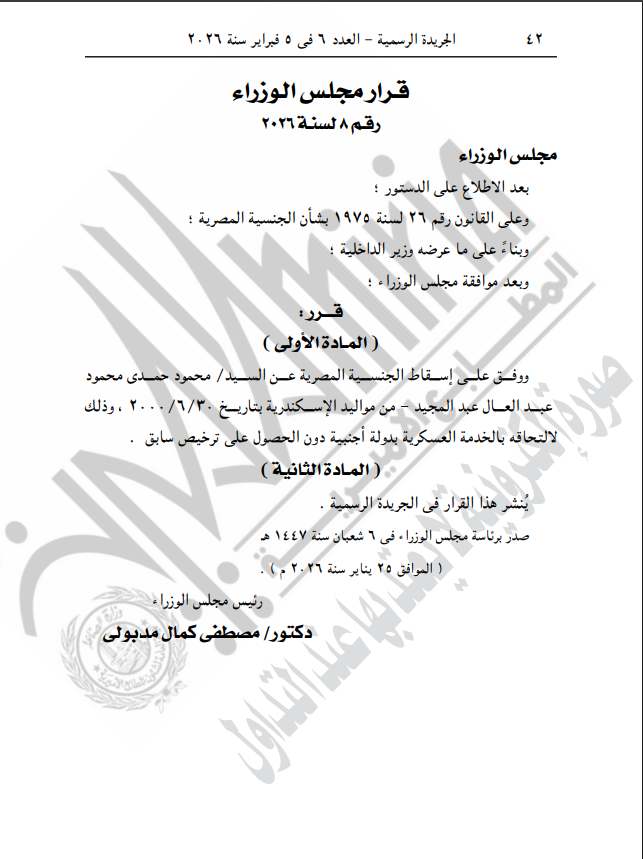 أصدر الدكتور مصطفى مدبولي، رئيس مجلس الوزراء، قرارًا بنشرته الجريدة الرسمية اليوم الخميس، يقضي بإسقاط الجنسية المصرية عن محمود حمدي عبد العال عبد المجيد.