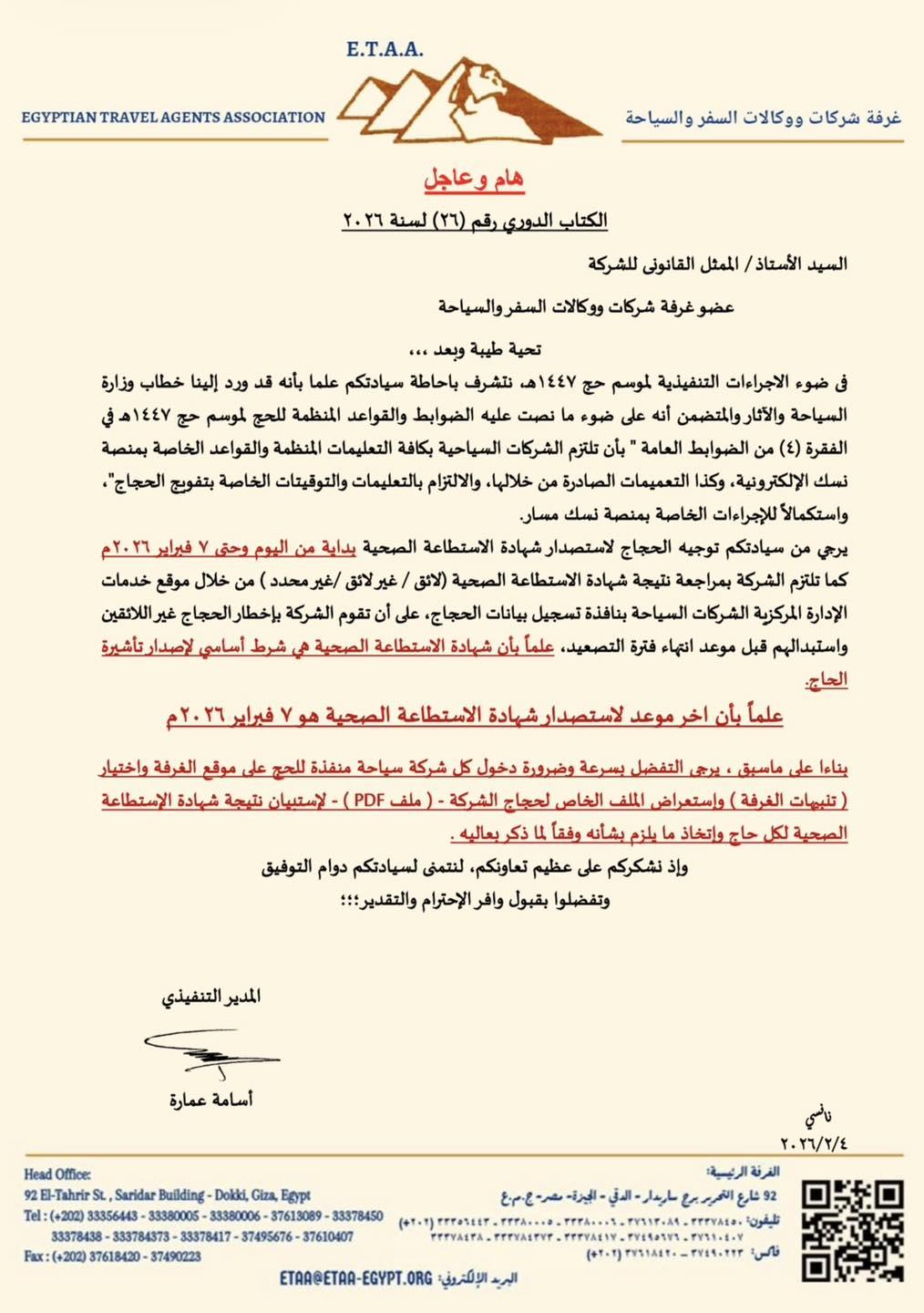 أعلنت غرفة شركات ووكالات السفر والسياحة أن اليوم السبت الموافق 7 فبراير 2026 هو الموعد النهائي لاستخراج وتسليم شهادة الاستطاعة الصحية للحجاج.