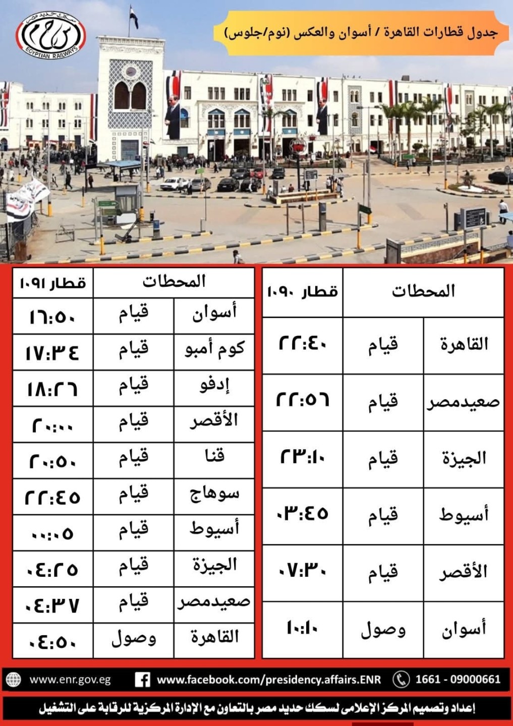 - توقيت الإقلاع: يغادر محطة أسوان عند الساعة 04:50 مساءً.