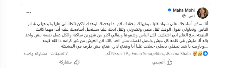 أعلنت الفنانة مها نصار، وذلك منذ ساعات تفاصيل الخلاف، وقامت بنشر منشور عبر صفحتها الرسمية بالفيس بوك، وقامت أيضًا بتعديله أكثر من مرة قبل أن تقوم بحذفه أخيرًا، وكتبت في المنشور قائلةً، "أنا ممكن أسامحك على سواد قلبك وغيرتك وحقدك، لإن ده يخصك لوحدك، ولكن تتطاولي عليا وتقلي أدبك عليا مستحيل أسامحك أبدًا"، وجاء باقي المنشور الذي نشرته كما يلي: