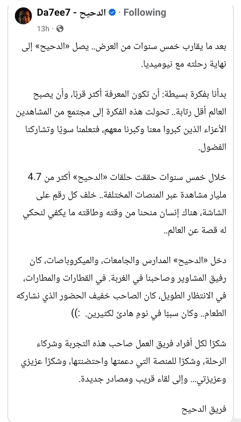 أعلن صانع المحتوى المعروف بأسم الدحيح، من خلال منشور عبر صفحته الرسمية بموقع التواصل الاجتماعي الفيس بوك، عن انتهاء رحلته مع منصة نيوميديا، وأكد بأن ذلك الفصل يمثل نهاية تجربة متميزة، وذلك بعد فترة استمرت نحو 5 سنوات من النجاح.