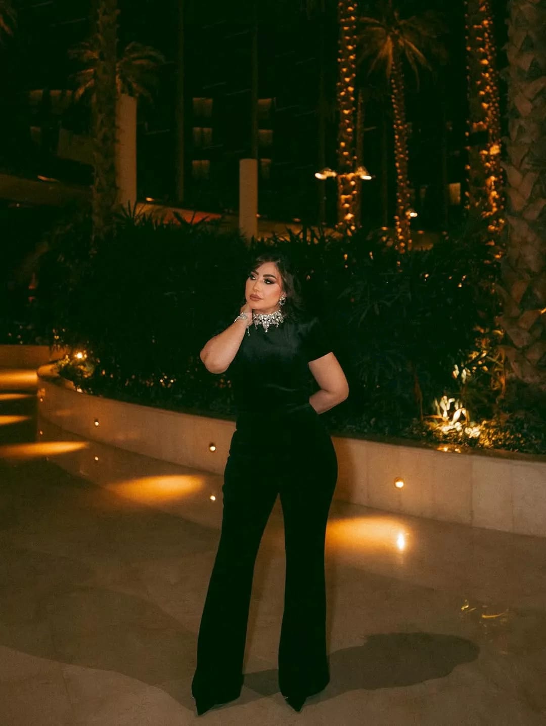اختارت بوسي جامبسوت باللون الأسود ما أضفى على مظهرها لمسة من الأناقة العصرية والبساطة في الوقت ذاته، وقد صمم الجامبسوت من توقيع المصممة البريطانية نادين مرعبي، ما أضفى لمسة فاخرة على الإطلالة.