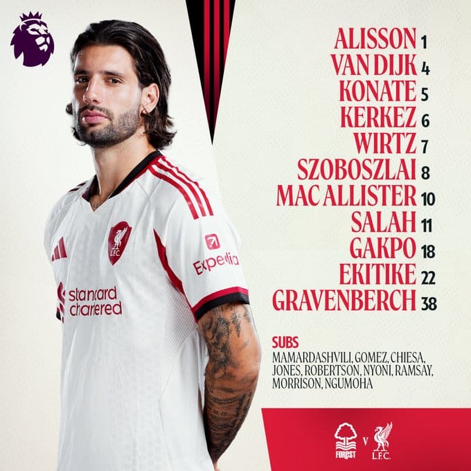 أعلن الهولندي آرني سلوت المدير الفني لفريق ليفربول التشكيل الرسمي لمواجهة نوتينجهام فورست في اللقاء الذي يقام على ملعب سيتي جراوند ضمن منافسات الجولة الـ27 من بطولة الدوري الإنجليزي الممتاز لموسم 2025-2026.