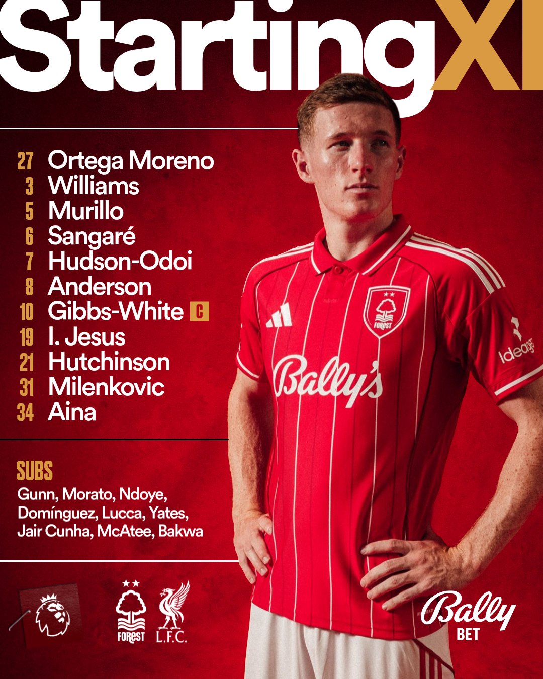 فيما يلي التشكيل الرسمي لنادي نوتينجهام فورست أمام ليفربول اليوم: