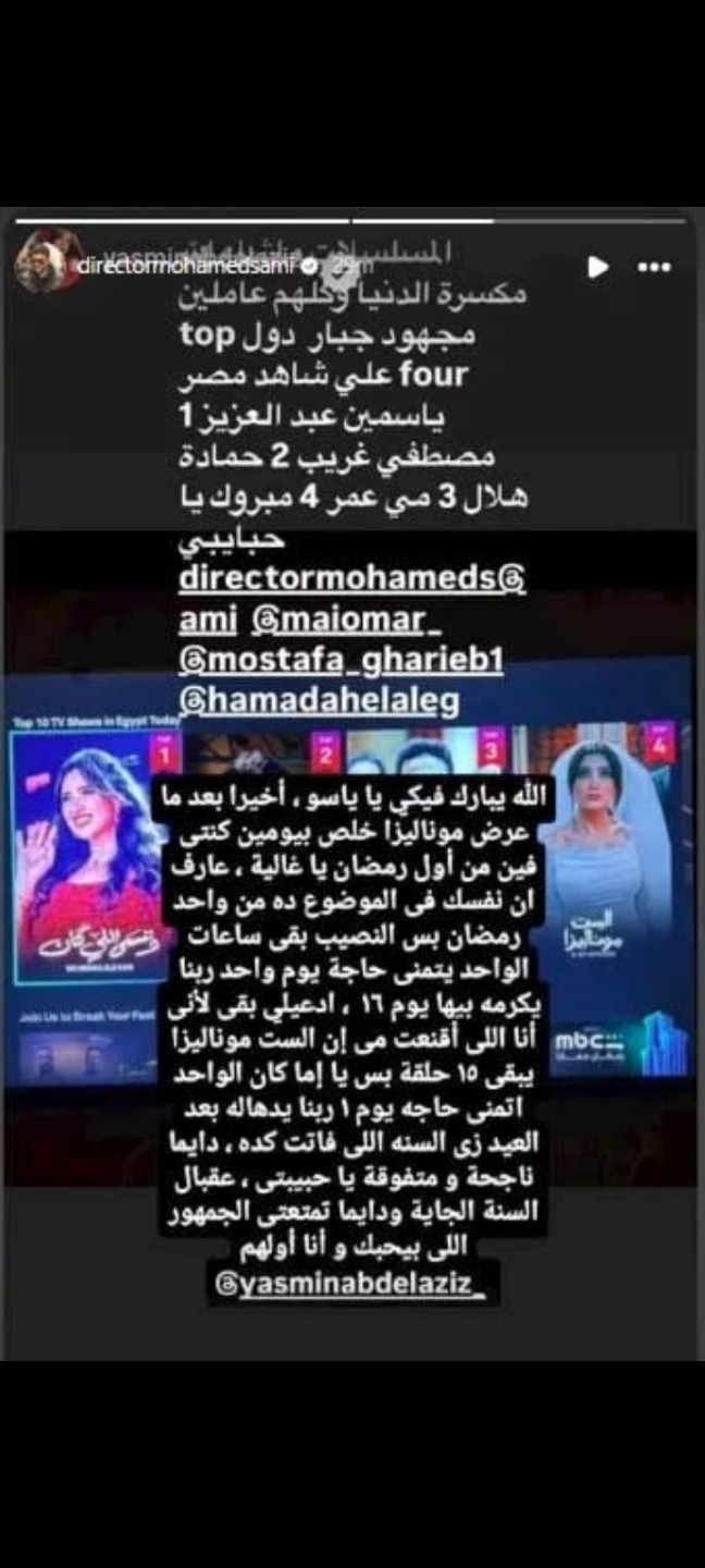 قام المخرج محمد سامي بإعادة نشر خبر تصدر مسلسل ياسمين عبد العزيز عبر خاصية الاستوري على إنستجرام موجهًا كلمات دعم لها، قال فيها: