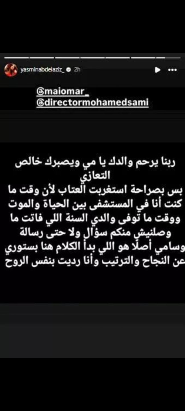 "ربنا يرحم والدك يا مي ويصبرك خالص التعازي.. بس بصراحة استغربت العتاب، لأن وقت ما كنت أنا في المستشفى بين الحياة والموت ووقت ما توفي والدي السنة اللي فاتت لم تصلني منكم رسالة أو سؤال، وسامي أصلاً هو اللي بدأ الكلام بستوري عن النجاح والترتيب وأنا رديت بنفس الروح."
