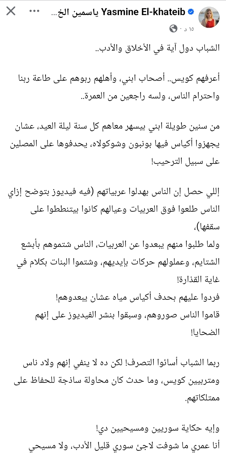 في أول تعليق لها على الواقعة، خرجت الإعلامية "ياسمين الخطيب" لتوضح ملابسات ما حدث من وجهة نظرها، مؤكدة أن الشباب الظاهرين في الفيديو معروفون لديها، وأنهم يتمتعون بسمعة طيبة وينتمون إلى أسرة مصرية ملتزمة، لافتة إلى أنهم عادوا مؤخرًا من أداء مناسك العمرة.