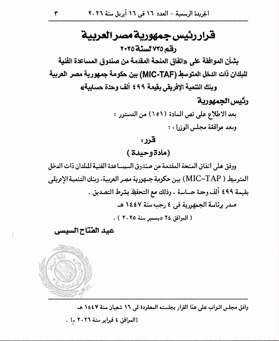 أصدر رئيس جمهورية مصر العربية عبد الفتاح السيسي اليوم قرار جمهوري بتاريخ 16 أبريل 2026 بشأن تأكيد قرار الموافقة على منحة صندوق المساعدة الفنية (MIC-TAF) المقرر عقدها بين الحكومة المصرية وبنك التنمية الإفريقي.