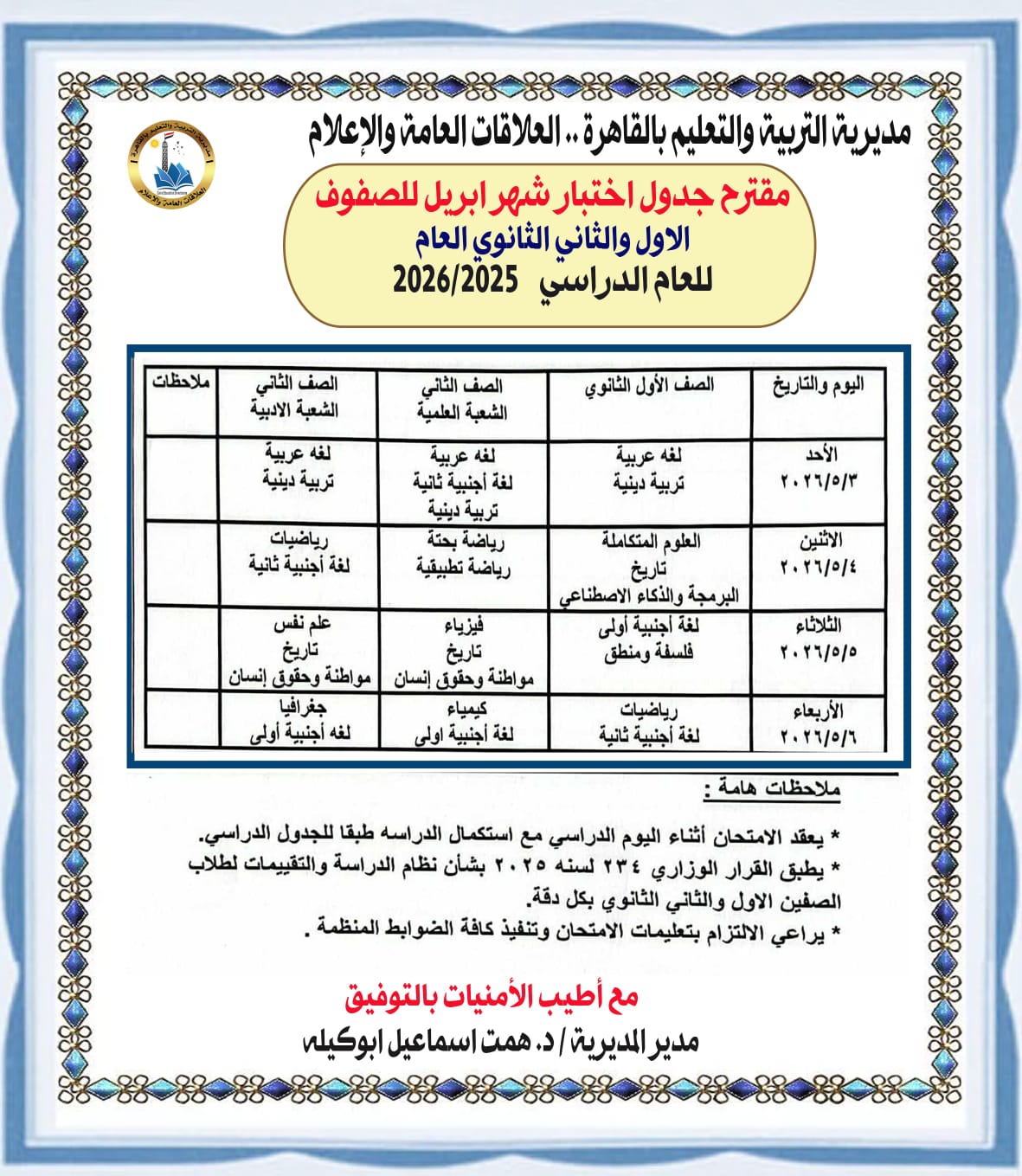 أعلنت مديرية التربية والتعليم بالقاهرة، تحت إشراف الدكتورة "همت إسماعيل أبو كيلة" مدير المديرية، عن طرح مقترح خاص بـ جداول امتحانات شهر أبريل لطلاب صفوف النقل بمختلف المراحل التعليمية، وذلك في إطار جهود المديرية لتنظيم سير العملية التعليمية وضمان الالتزام بالخريطة الزمنية للعام الدراسي.