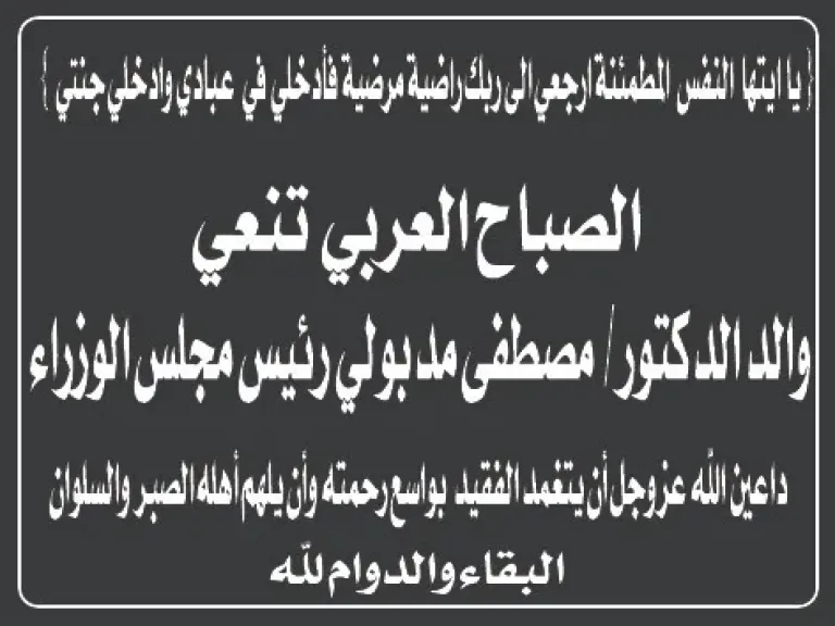«الصباح العربي» ينعى والد الدكتور مصطفى مدبولي رئيس مجلس الوزراء